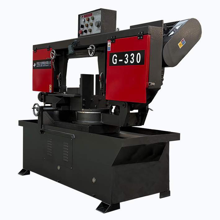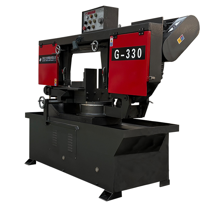 G330角度锯床作为旋转角度带锯床的代表,一直备受国外客户青睐。锯床为剪切式结构,引进和吸收国外同类锯床的性能特点,配备液压平衡油缸,高强度平衡弹簧及液压无极调速系统。在锯切时,锯架可正向旋转0°—45°或反向旋转0°—60°,适应锯切有角度要求的角钢、圆钢、矩形管等。