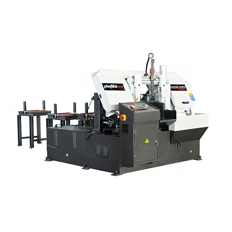 济南北方金锋锯业有限公司是一家专业生产带锯床、带锯条的非标定制锯床厂家,金锋锯业现有的数控带锯床型号有GS260带锯床、GS280带锯床、GS330/400/500带锯床等,这些数控锯床都采用PLC控制系统,可设置一组或几组连续切割,适用于批量生产的大型厂家。配有彩色触摸屏,直观简洁,可快速上手。采用光栅尺控制送料长度,精度高。切割平稳噪音小,切割出来的材料光滑无毛刺、废料少。其中GS280带锯床为剪切式结构,锯架可旋转0-45°。GS330/400/500带锯床为双立柱结构,更加稳定。